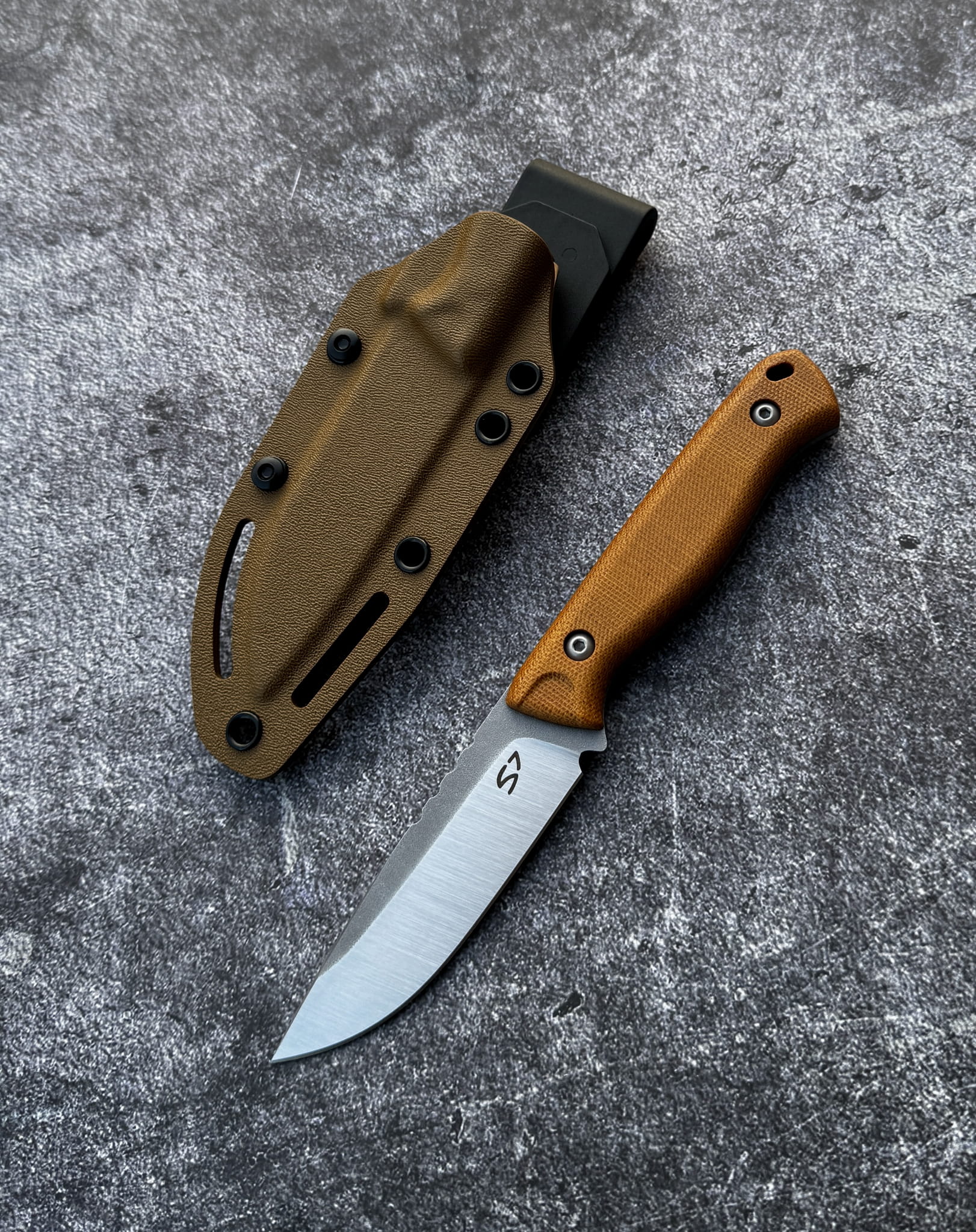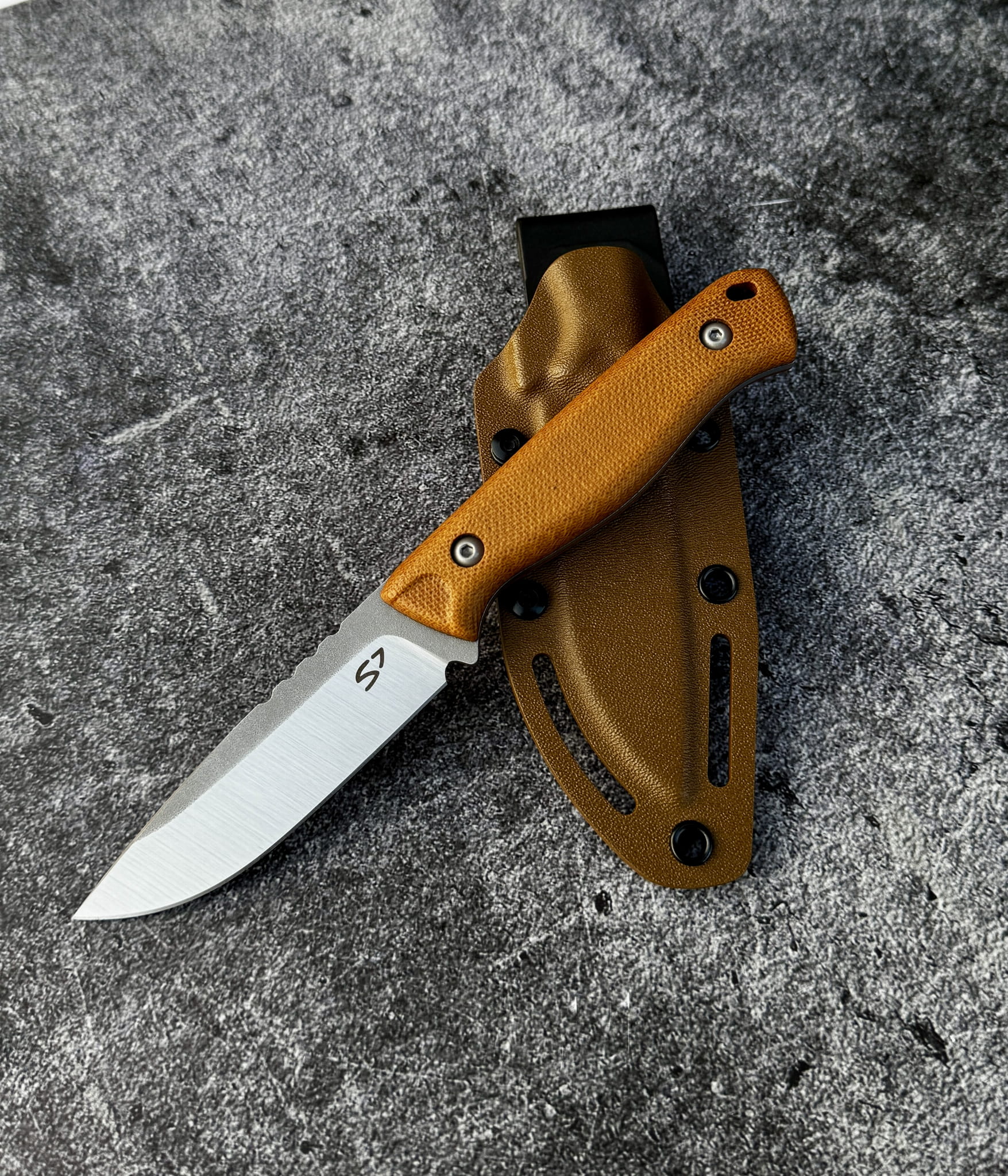 Materiał rękojeści: Canvas Micarta w kolorze naturalnym (musztardowym). Materiał z czasem może delikatnie ciemnieć pod wpływem światła i użytkowania – jest to naturalna cecha Micarty.